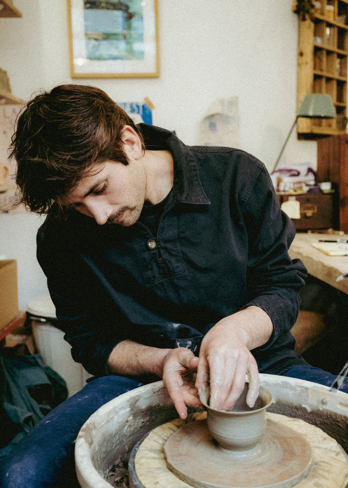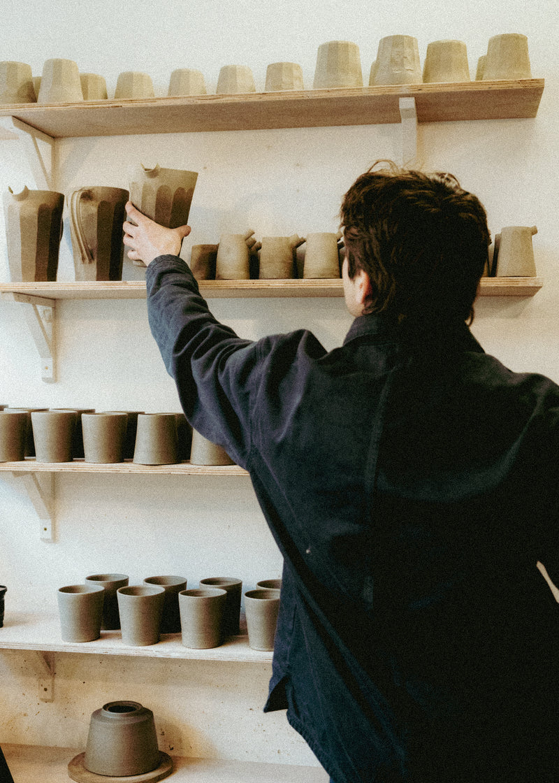 Right now, he’s building towards a spring collection, introducing new forms like a stem vase and a fluted cup. Alongside it, a short film shot on 16mm in collaboration with Collected Film. Another thread from a previous life finding its way back in. Film and clay sitting side by side.