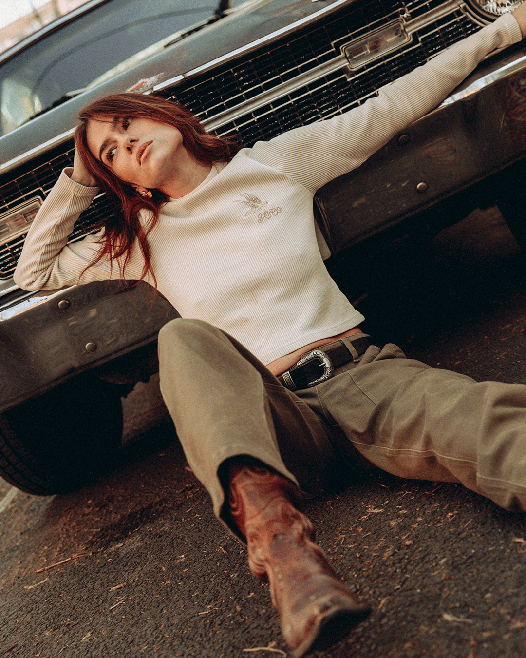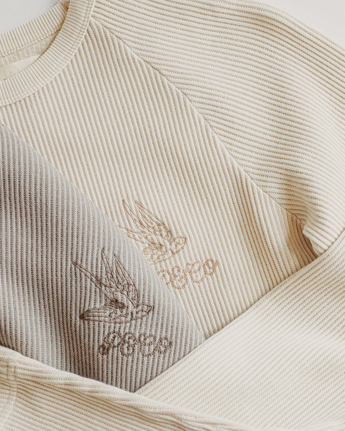 The Swallow Longsleeve in oatmeal is a fitted long-sleeve tee made from a heavyweight knit cotton. It features a ribbed crew neck, tonal direct embroidery, and a raglan sleeve construction. Our organic cotton is grown without pesticides or synthetic chemicals. On average, 62% less energy and 91% less water is used- producing 62% less CO2 than standard cotton.