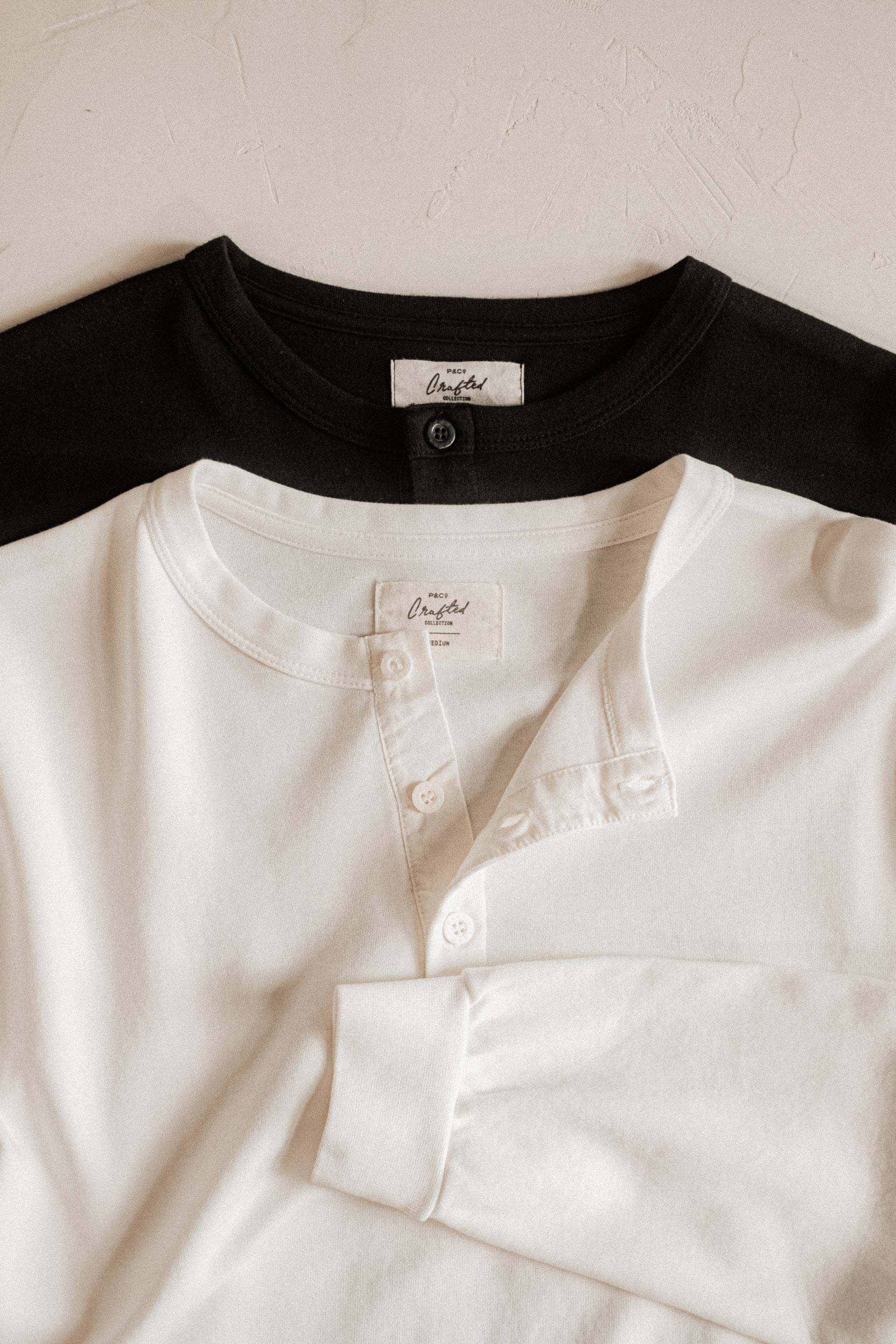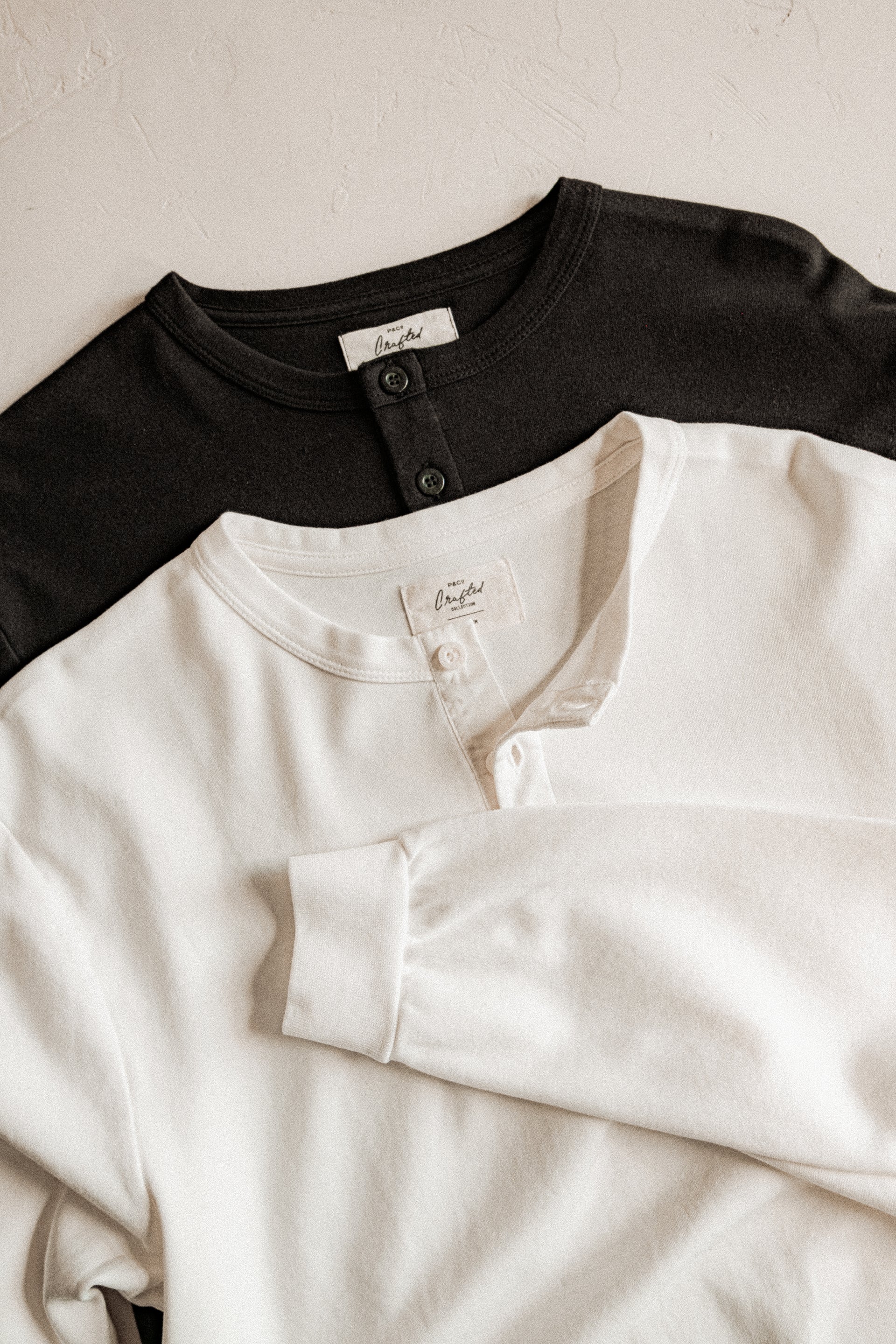 We’ve taken that history and built our own version: the Crafted Heavyweight Henley. Made from 300gsm organic cotton, finished with a button placket and considered details, it’s designed to last and to be worn hard.