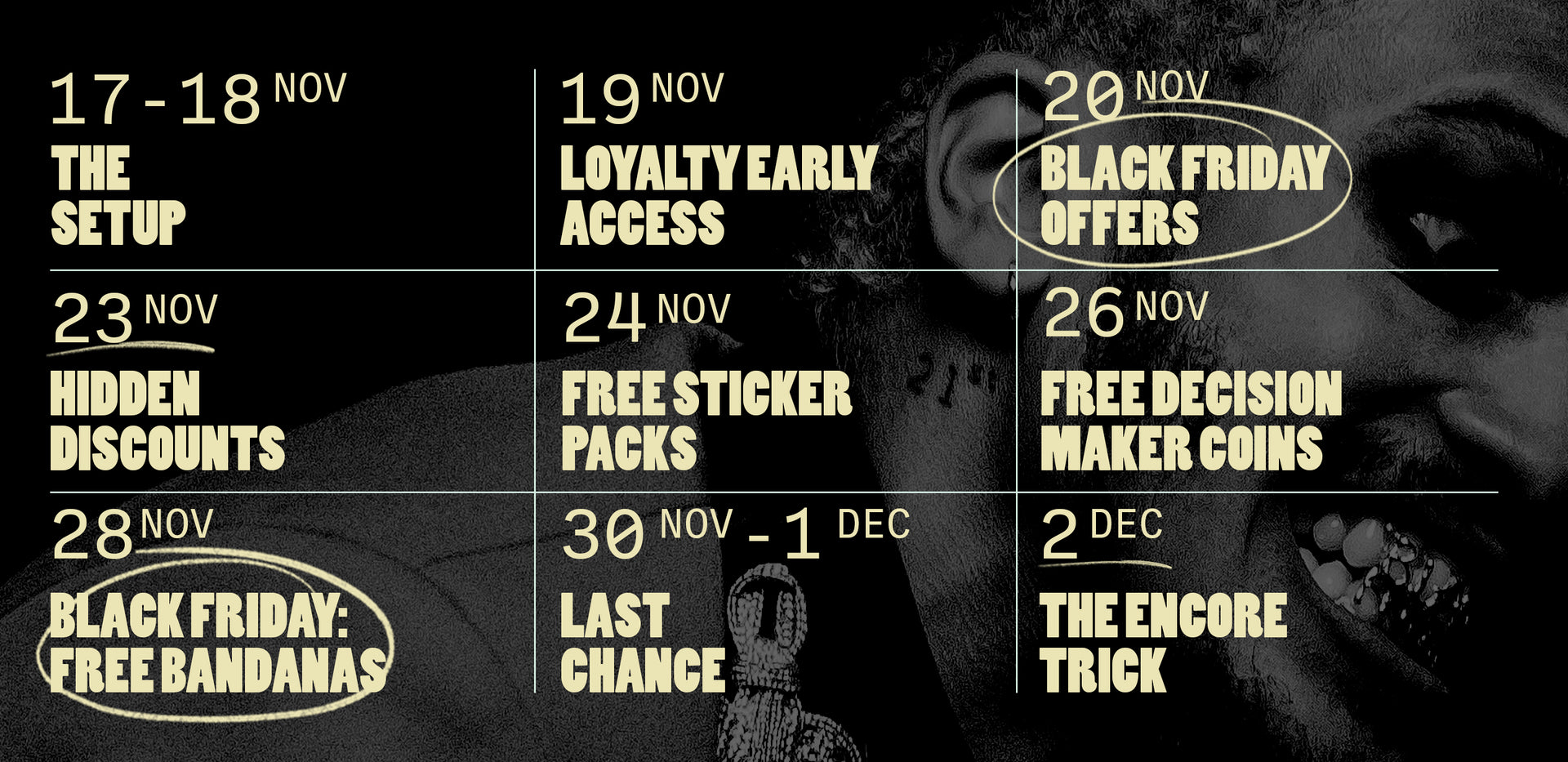 Every day will bring a new act, deals, and surprises. Our Black Friday Calendar lays out everything we've got going on, so you can make the most of Black Friday without any shocks.